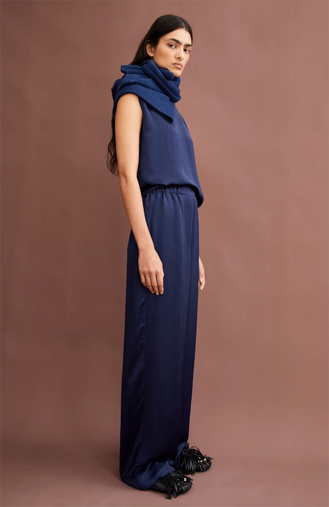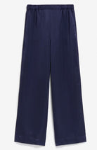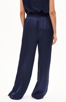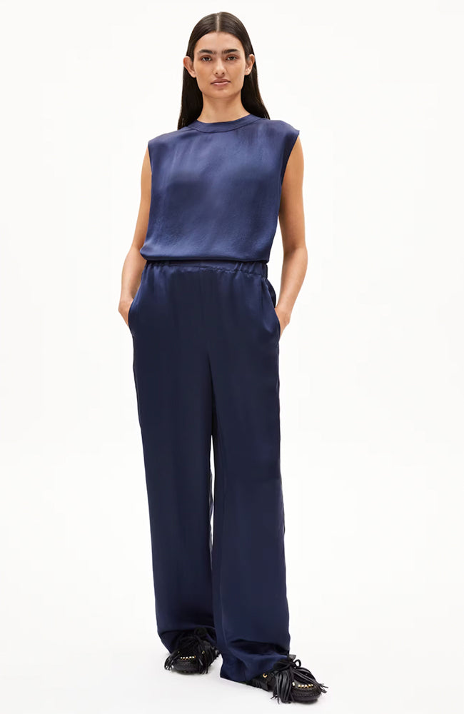 Hip, wide leg pants in a blue 'tinted navy' color from ARMEDANGELS. The model has a high waist with side pockets, a seam on the front and elastic waist. The model falls a little wider than normal with an inseam of 77 cm. The model in the picture is 1.75m tall and wears size S.