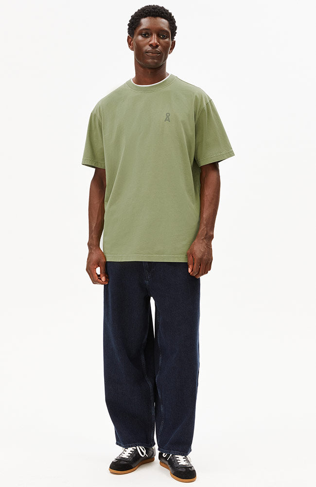 This classic T-shirt fromARMEDANGELS is a must-have for a timeless, minimalist look. Available in the stylish color fatigue green washed, a beautiful light green shade, this shirt is the perfect basis for any outfit. The shirt is made from organic cotton, has a regular fit, round neck, and a logo on the left chest.