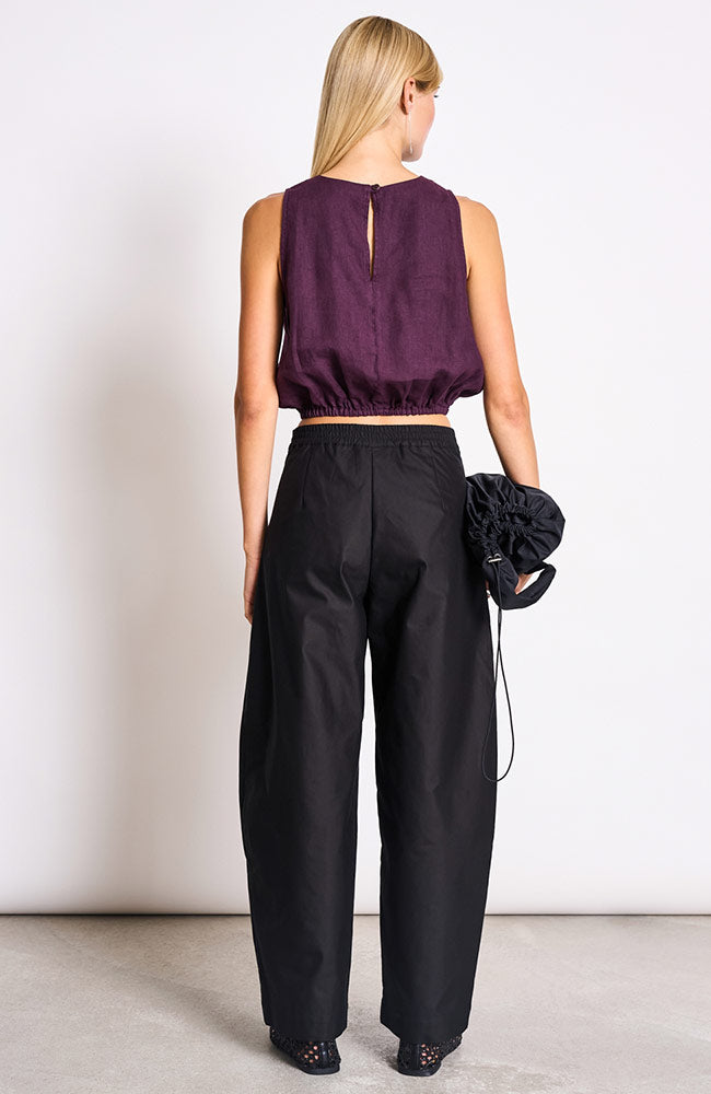 This dark red Lupin crop top (cherry lacquer) from JAN 'N JUNE is a stylish basic with a modern twist. The sleeveless design features an elegant high neckline and The subtle sheen gives it a luxurious feel, while the elastic hem creates a playful, billowing effect and a comfortable fit. The top is made of lightweight linen, making it ideal for hot summer days. Pair the Lupin top with the matching Sjov pants.