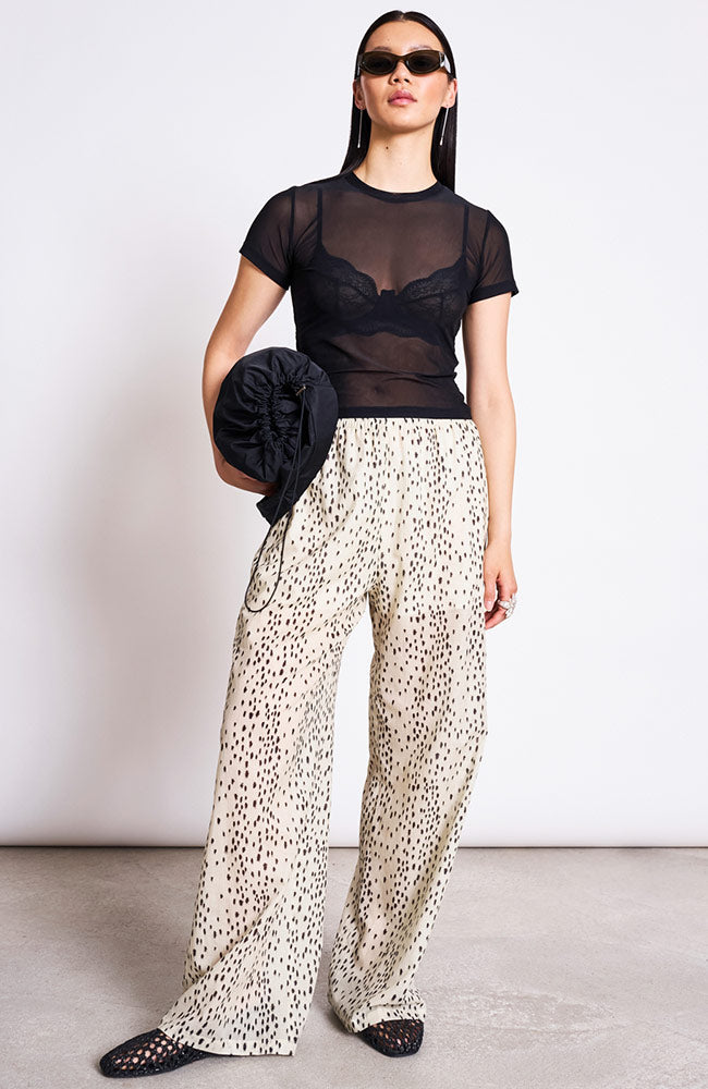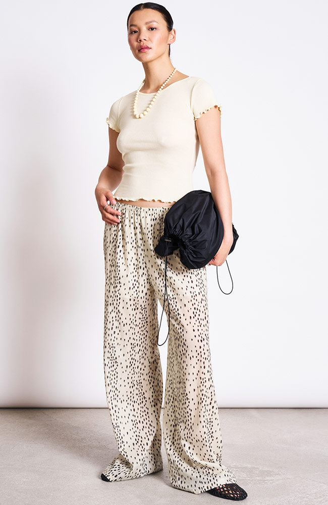 The Origan pants in butter milk with Dalmatian dots are a new style of JAN 'N JUNE. These pants have a loose fit, a mid-rise waist, and long, wide legs. They're made from organic cotton, making them wonderfully soft and supple. The all-over print gives these pants a bold look, while the relaxed fit ensures comfort. They're easy to pair with both casual and dressier outfits.