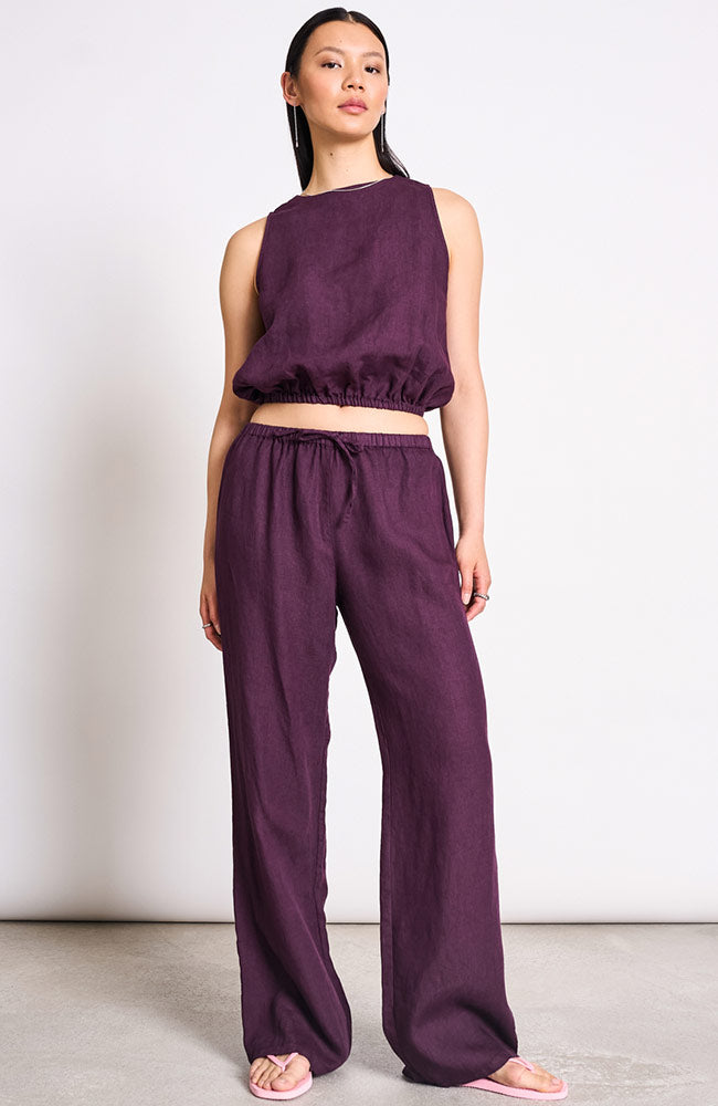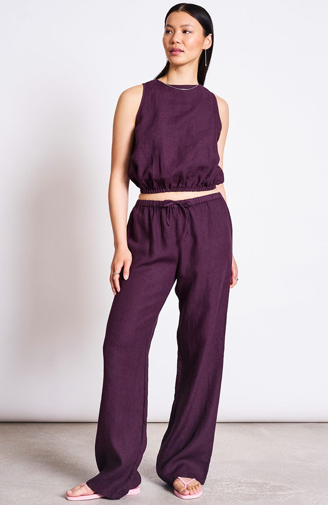 These linen pants from JAN 'N JUNE features a beautiful, deep red color (cherry lacquer), a mid-rise waist with a drawstring and elastic, and long, wide legs. The pants are made from 100% European linen, making them nice and breathable and perfect for warm days.
