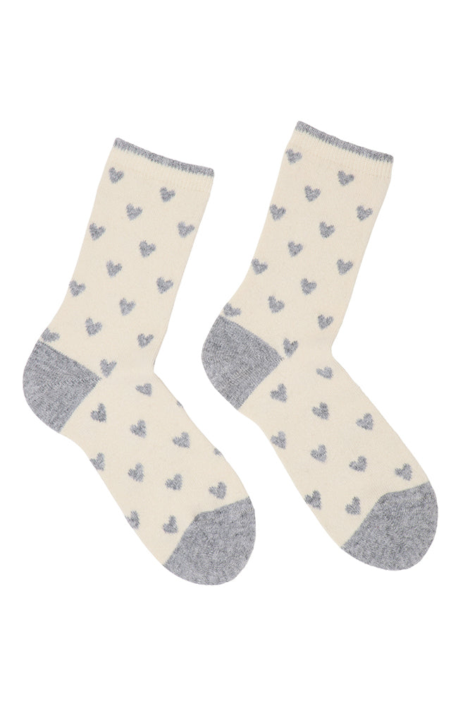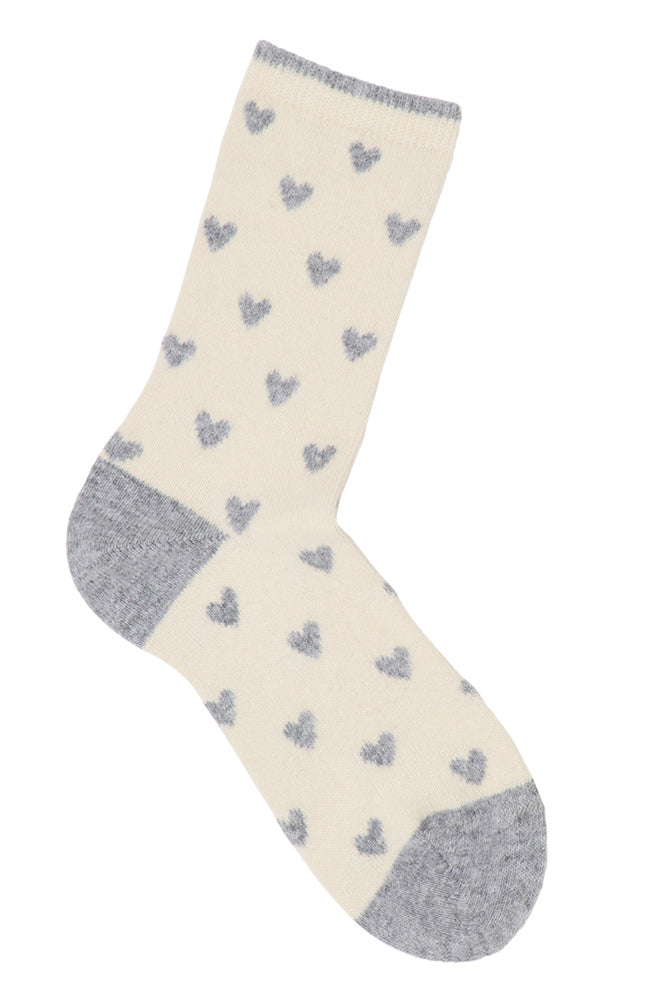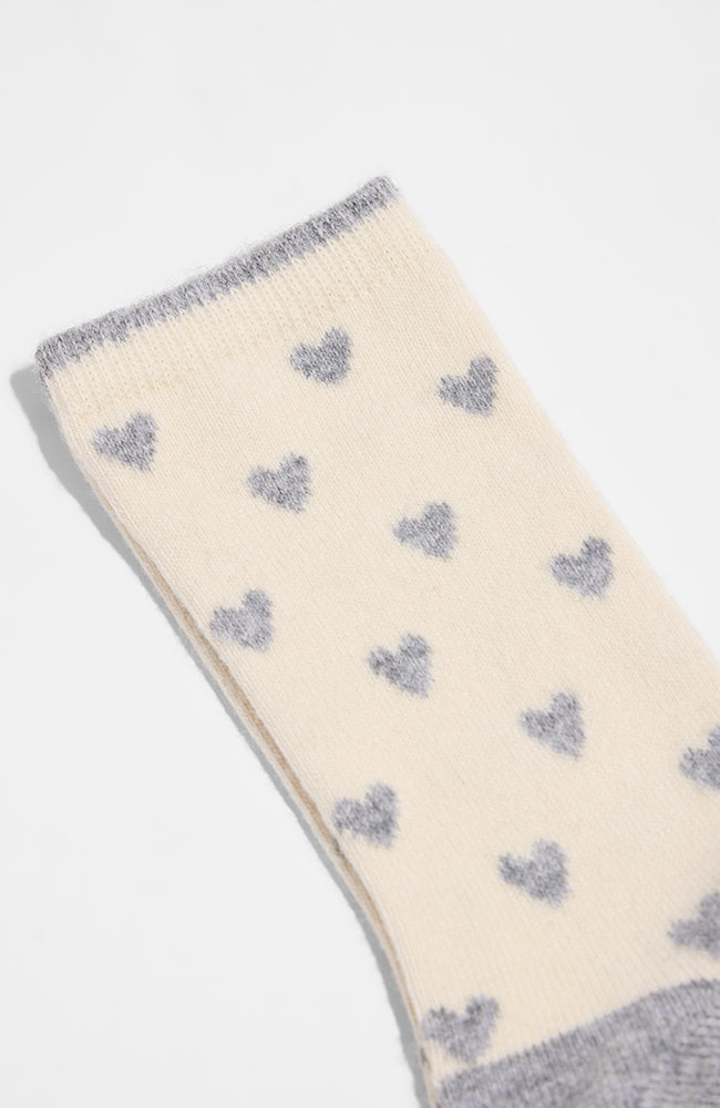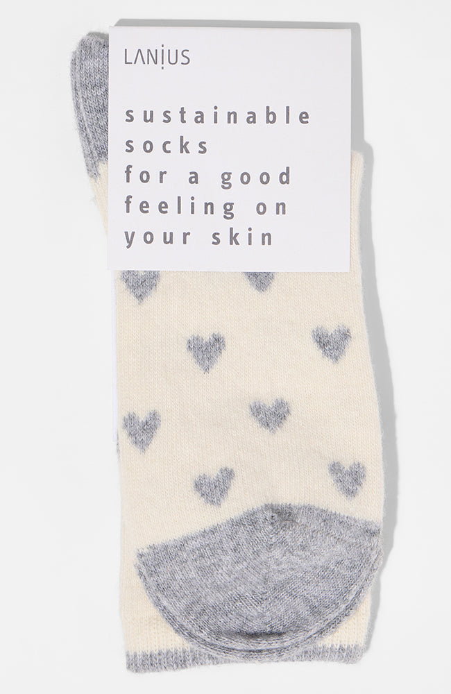 Heerlijk warme sokken van het merk Lanius gemaakt van bio katoen en zacht scheerwol. De sokken hebben een off-white ondergrond met grijze hartjes en een grijze teen, hak en randje aan de bovenkant.