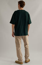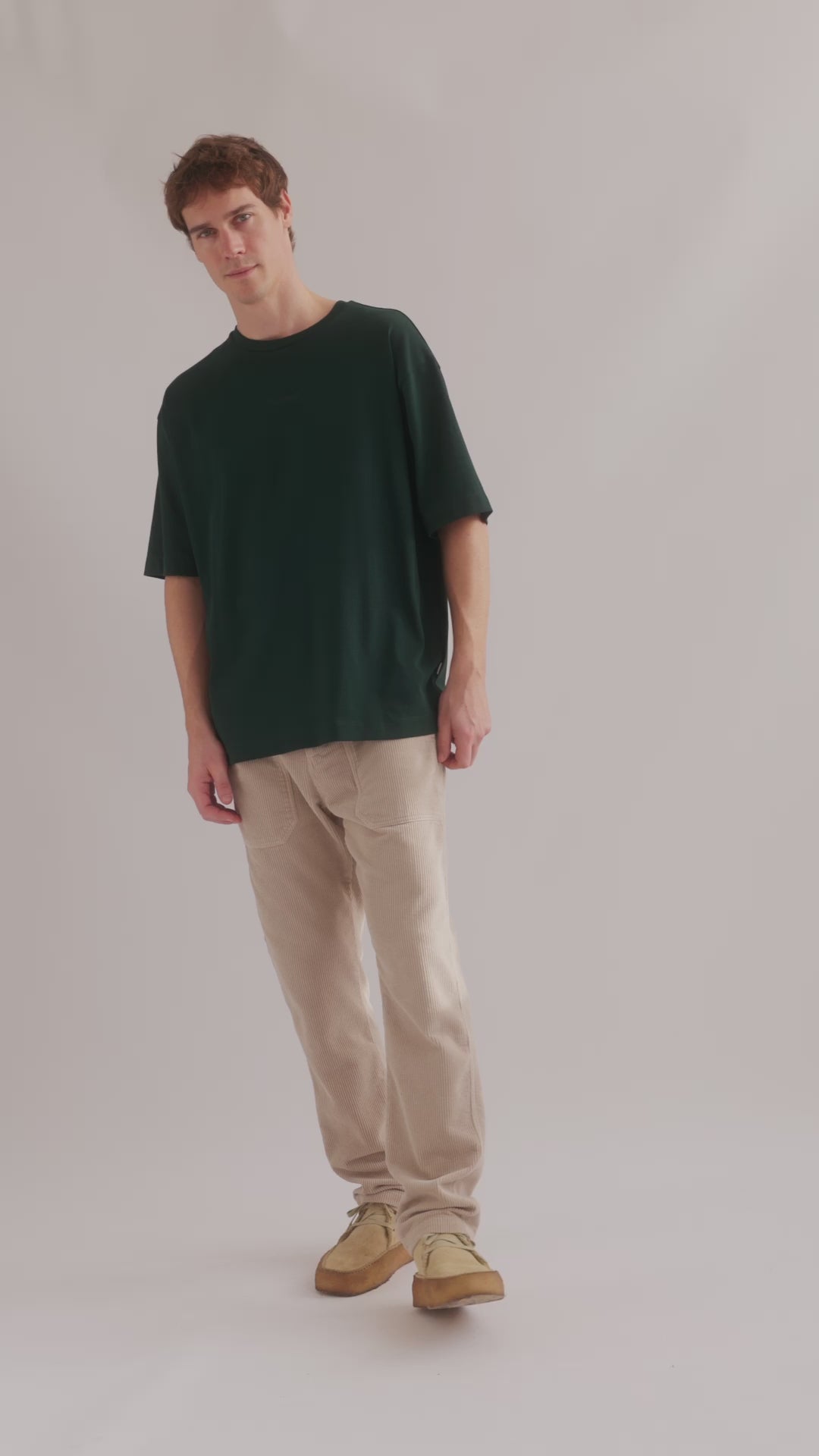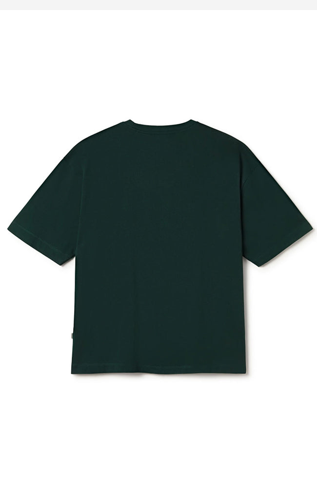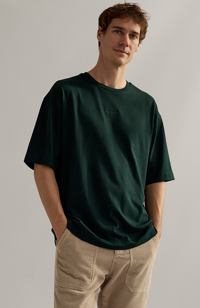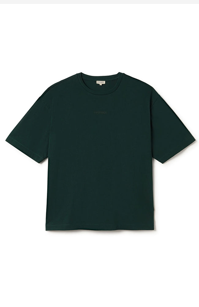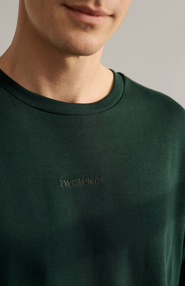 Cute dark green t-shirt from Spanish brand TWOTHIRDS. The shirt is made of slightly heavier/thicker organic cotton, has drooping shoulders and falls oversized. On the front the brand logo is embroidered in the middle.