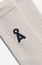 Beautiful off-white sports socks from ARMEDANGELS with a black A on the side. The socks are made of sustainable organic cotton.