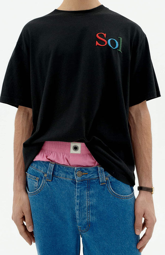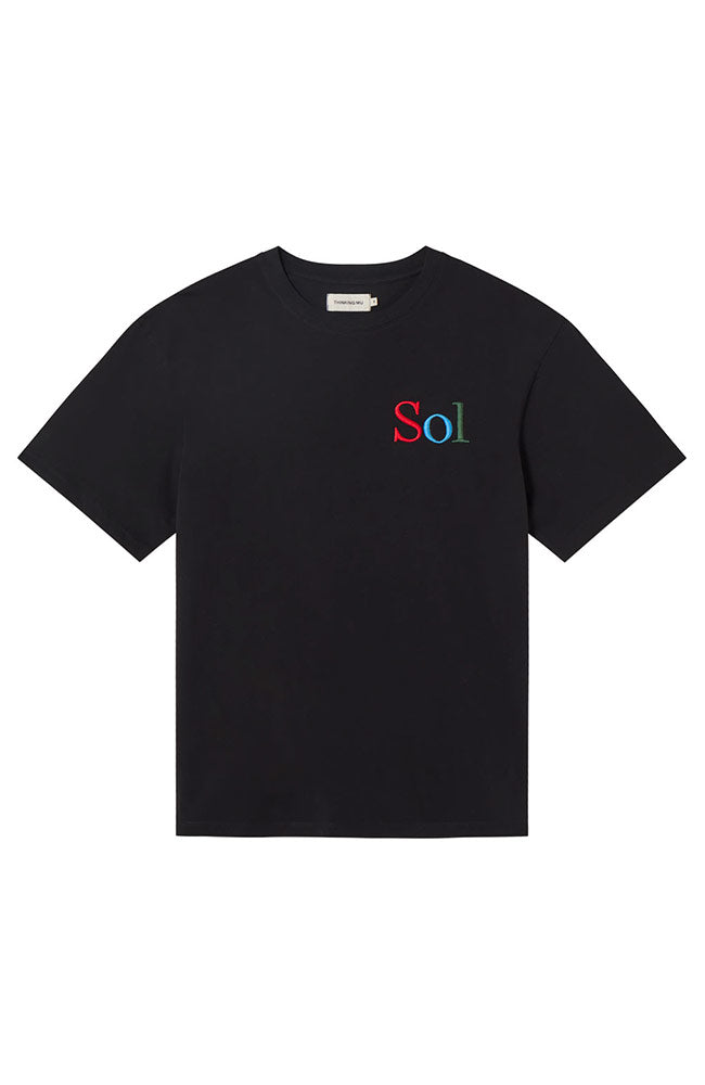 Cute black T-shirt from Thinking Mu featuring the text SOL on the chest. This shirt falls oversized, otherwise has a classic t-shirt model with a round neckline.