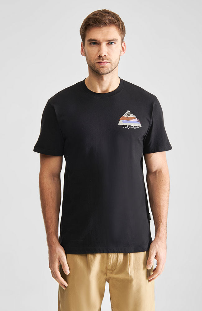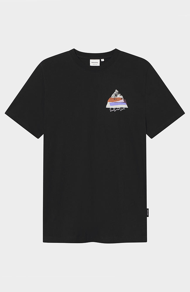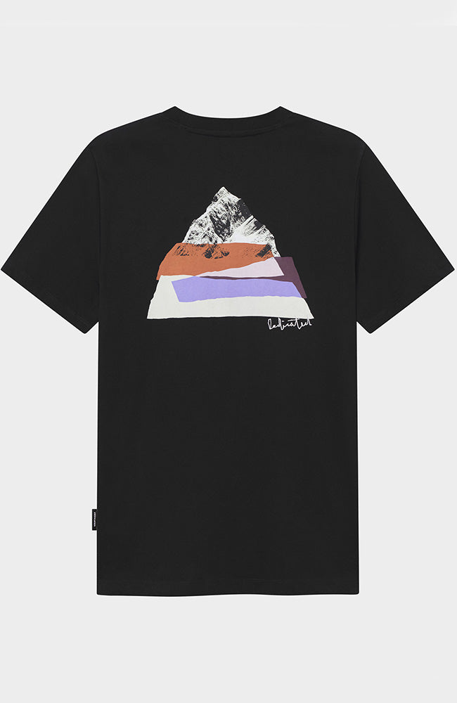 Beautiful basic shirt with a print of a mountain on the front from the brand Dedicated in the color 'charcoal'. The model has a round neck, short sleeves, a regular fit and round hem. The shirt is made of soft and sustainable Fair Trade organic cotton.