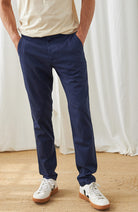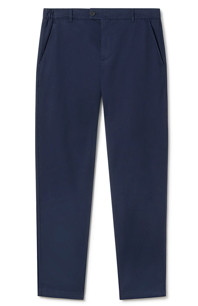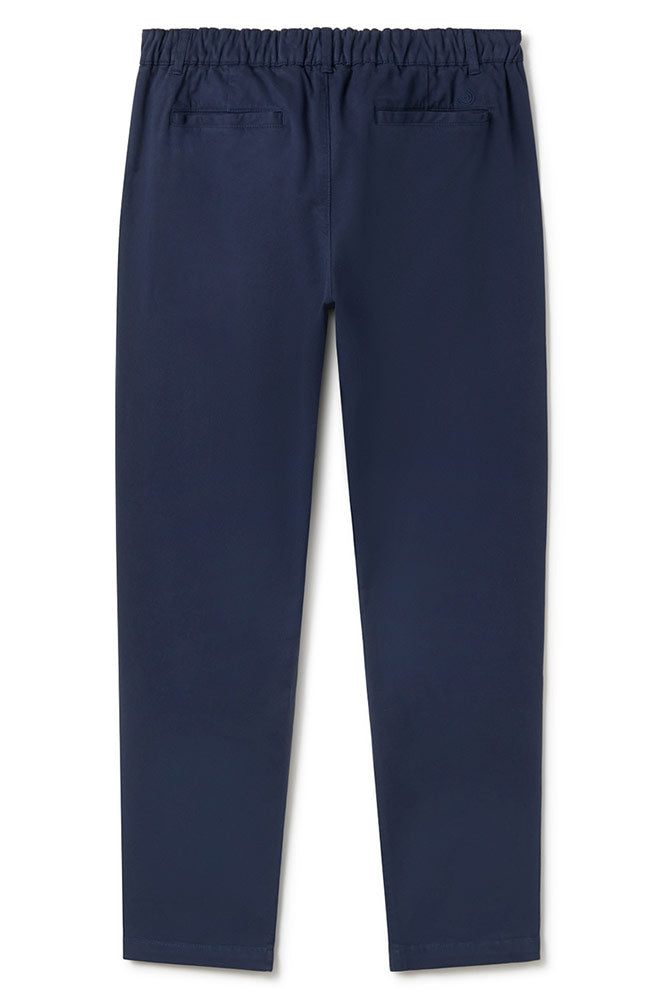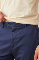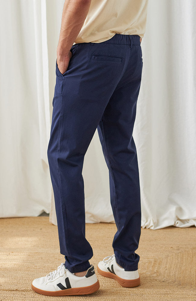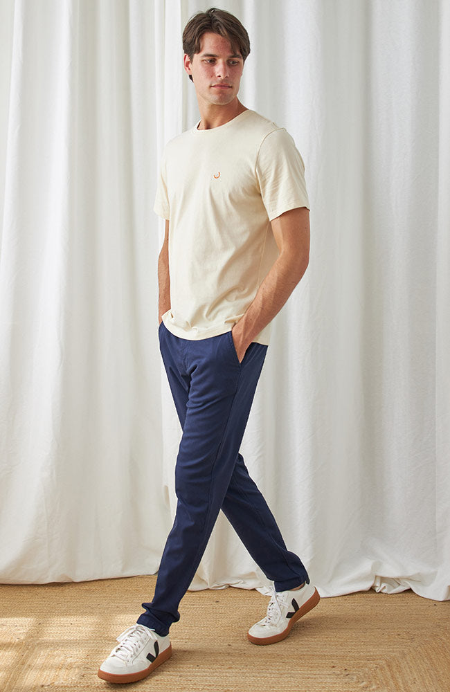 Beautiful dark blue chino from the brand TWOTHIRDS. The pants are made of a blend of the materials TENCEL and ECOVERO viscose which makes them feel super soft and comfortable. Furthermore, this chino has an elastic band, side pockets and a button closure.