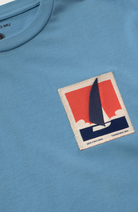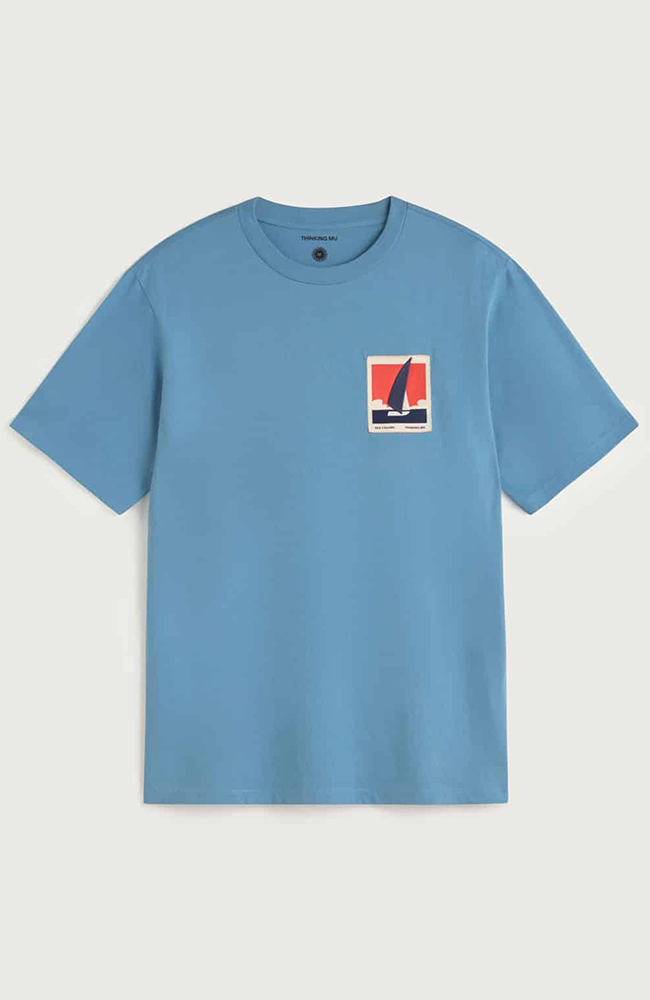 Cute blue T-shirt from Thinking Mu with an image of a sailboat on the chest. This shirt has a classic T-shirt style with a round neckline.