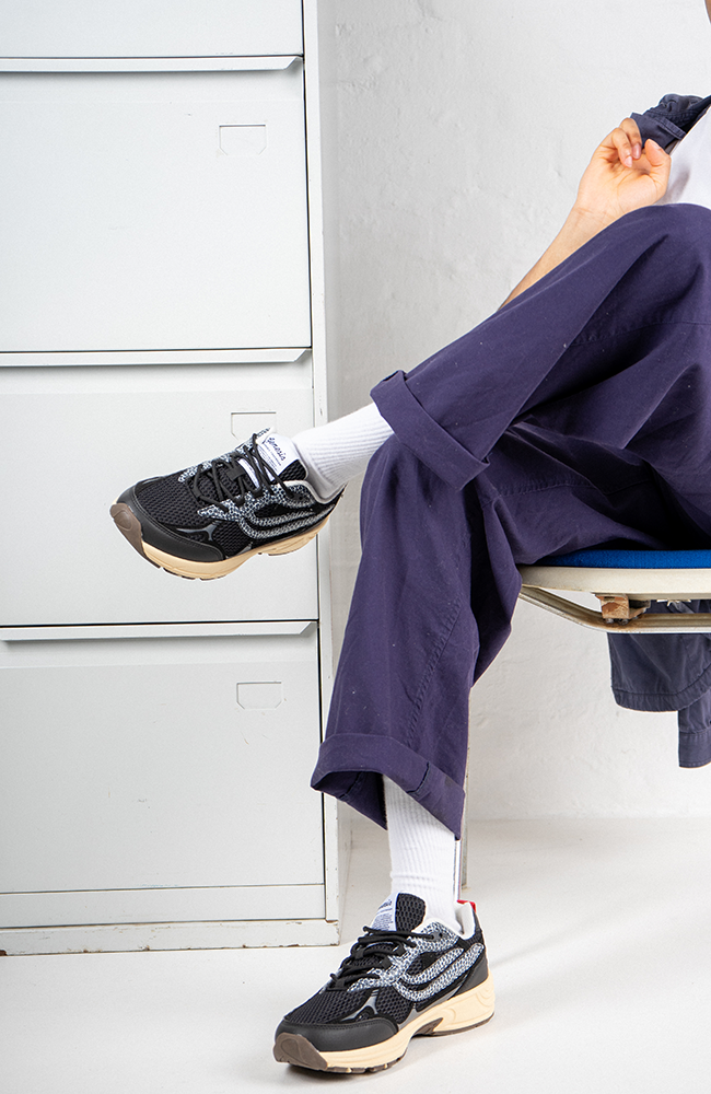 These beautiful vegan sneakers are from the sneaker brand Genesis Footwear! The sneakers have a 'running' model and are made from a combination of corn waste (for the vegan leather), sugar cane (vegan suede), recycled PET bottles (laces), recycled PU foam + FSC cork (insole), sustainably grown rubber (sole), and REWAVE™ bamboo (lining). In other words, all vegan and more sustainable materials. This version of the G-Eco '99 Embo model is black with black and white panther accents. They are wonderfully comfortable to walk in thanks to the thick sole and breathable mesh on the outside.