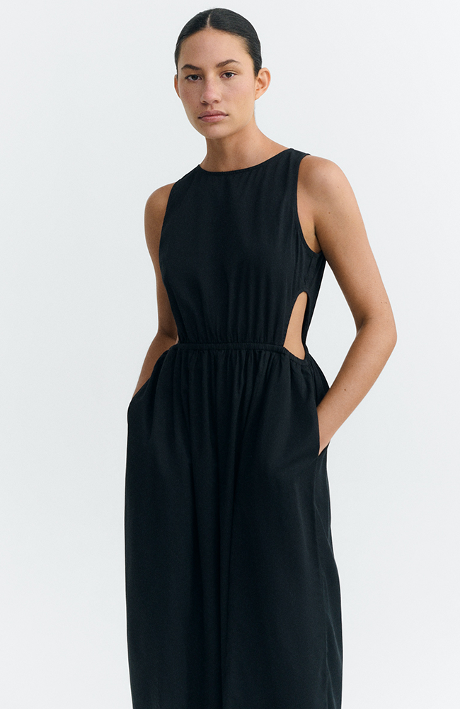 Beautiful black midi summer dress from Thinking MU. This dress has a high, round neckline, cutouts on the sides, and elastic at the waist, giving it a flattering fit. Made from soft organic cotton (cupro), it is light and comfortable to wear.