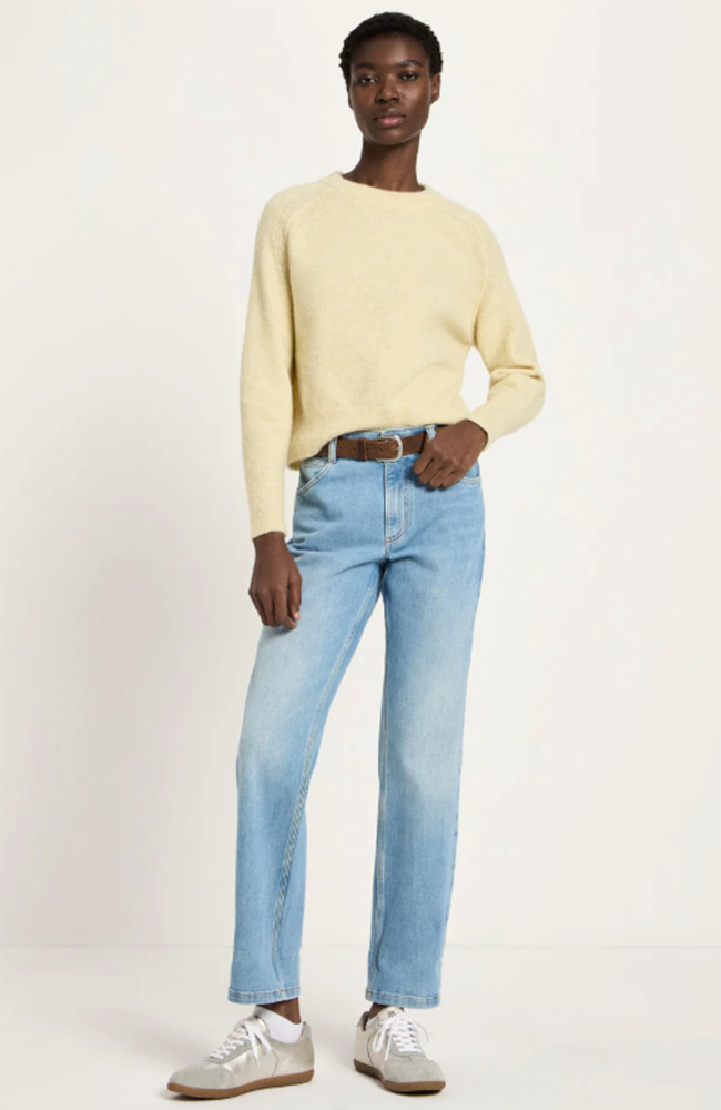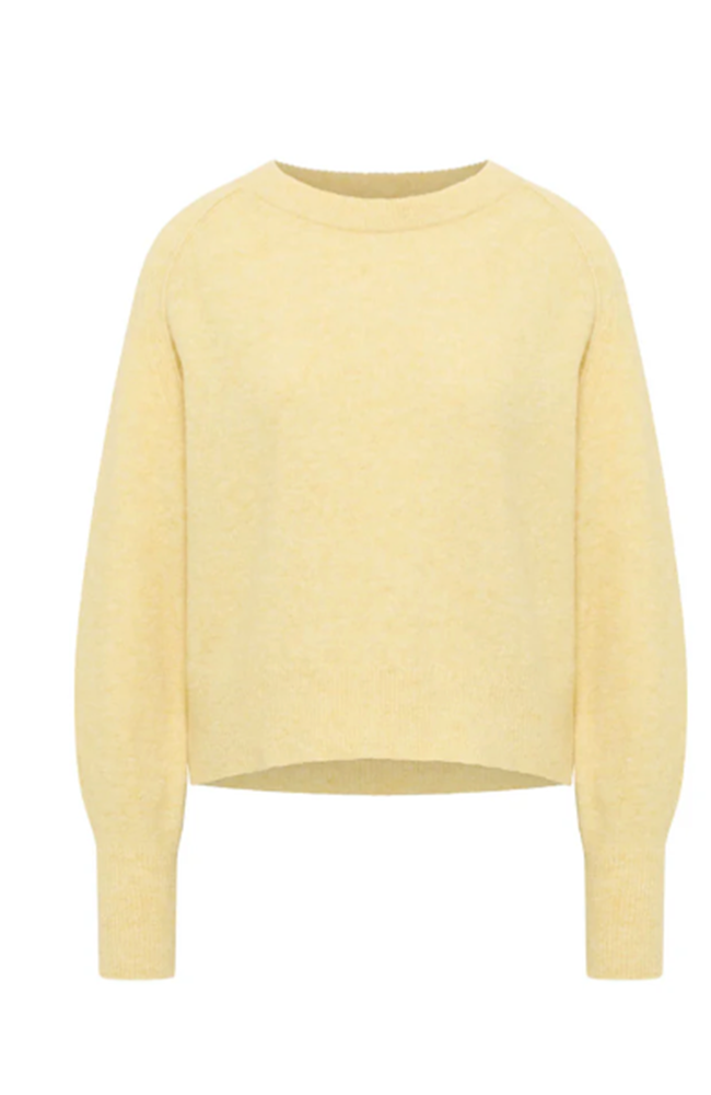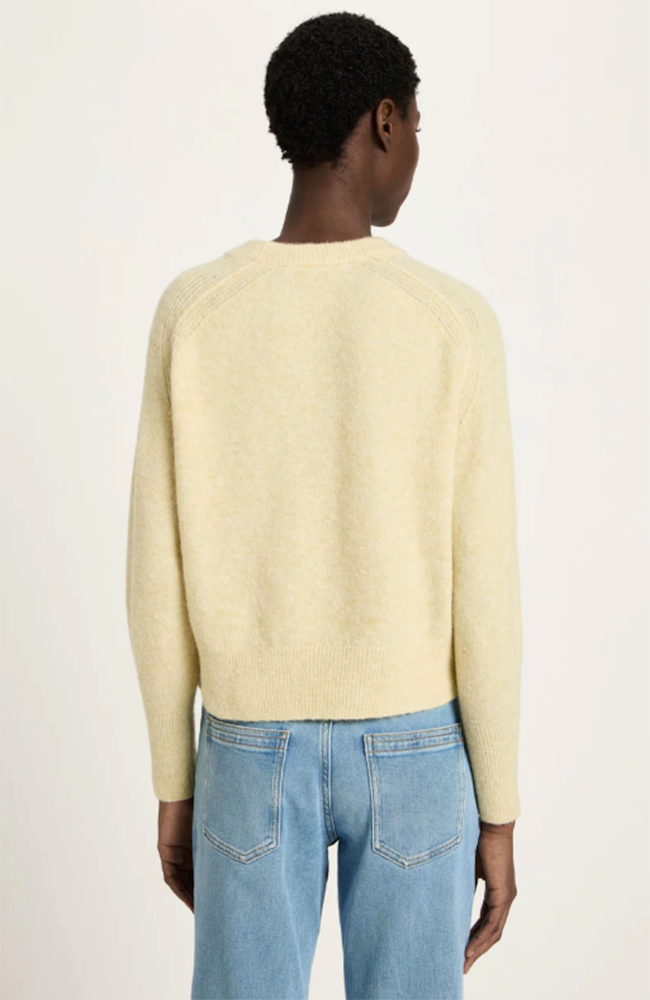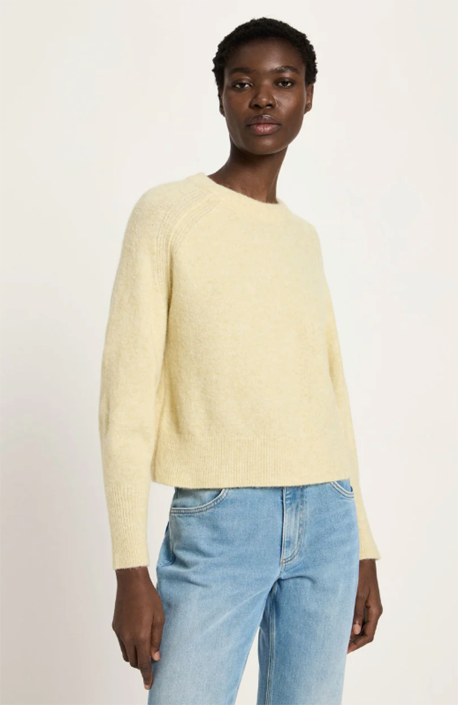 Prachtige trui van het merk Lanius in een mooie 'pastel sun melange' gele kleur. Deze super zachte trui heeft een ronde hals en raglan mouwtjes (schuin ingezet). Ze is gemaakt van verschillende soorten wol.