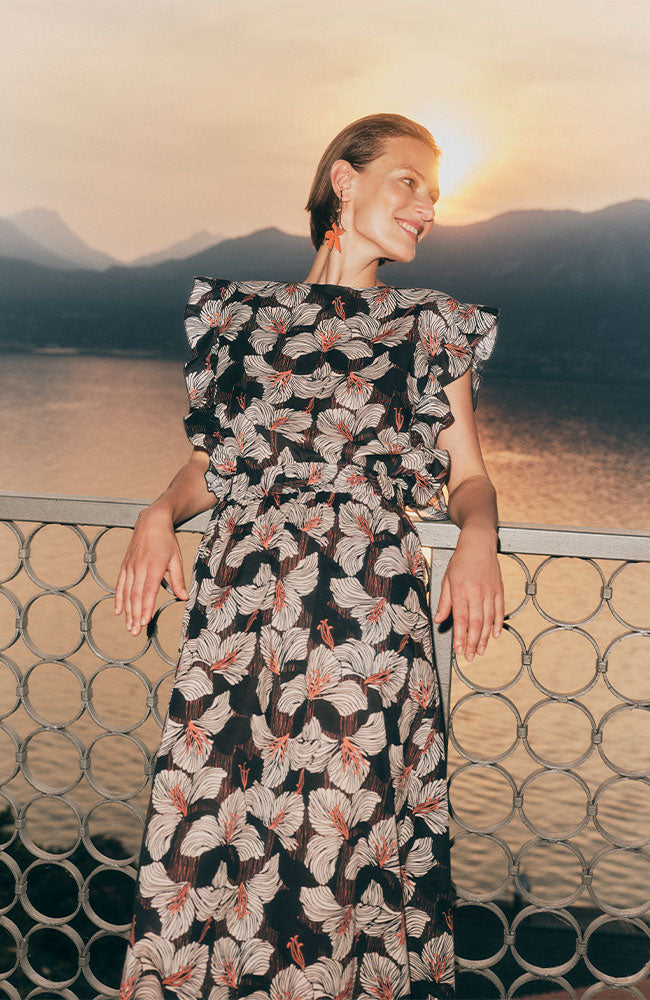 Summer midi skirt from LANIUS with an abstract floral print in black, white, and a touch of orange. The model has an elegant midi length, wide flared fit, pockets, and an elastic waistband for extra comfort. Made from 100% GOTS certified organic cotton. Great to combine with the matching blouse!