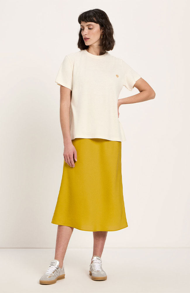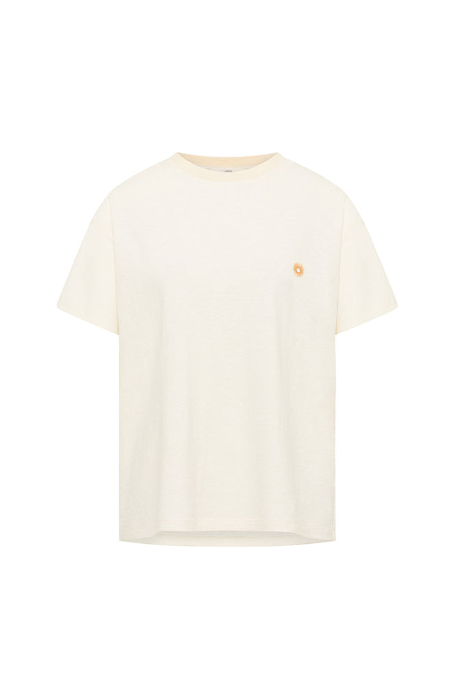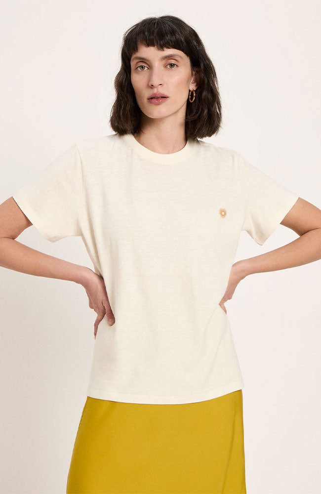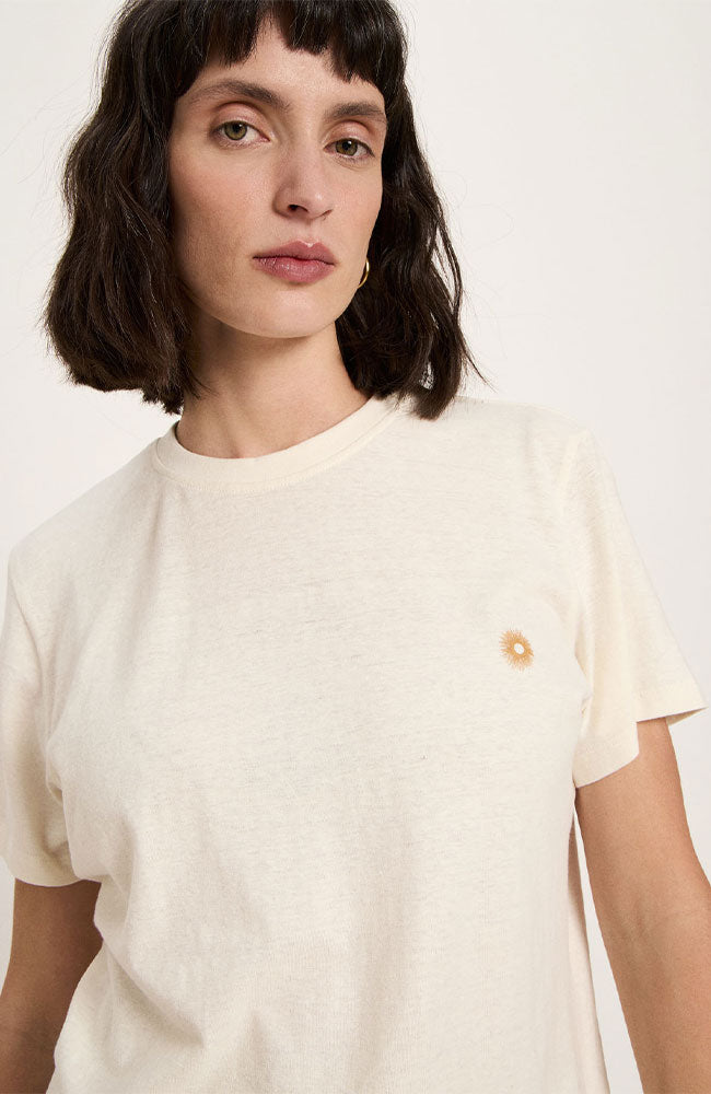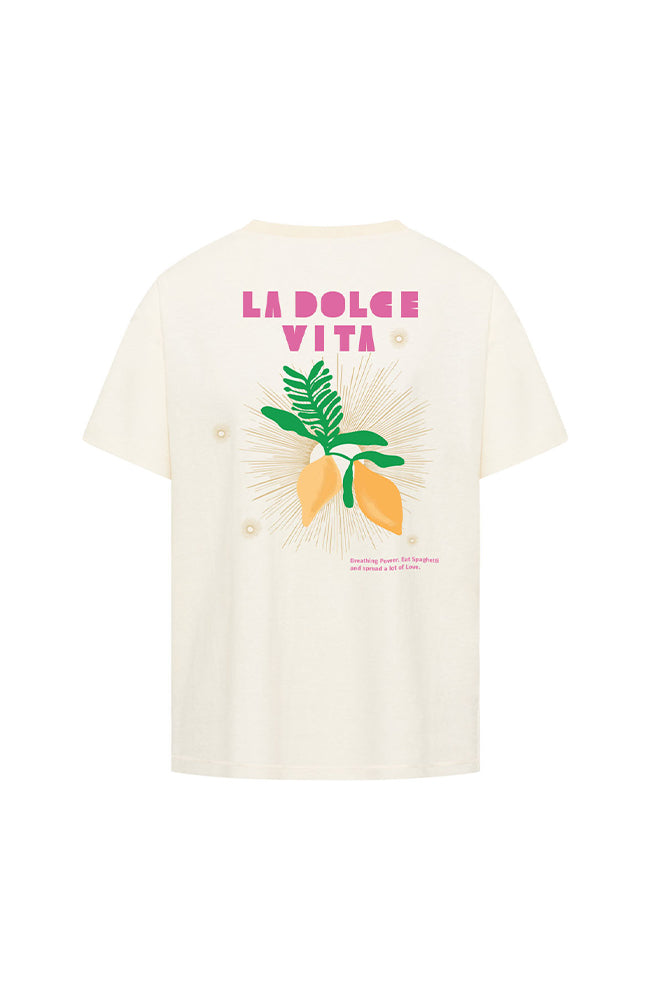 Cute off-white T-shirt with a dolce vita text and illustration from the German brand LANIUS. The shirt has short sleeves, a high round neck, and a cool print on the front and back. It is made from an undyed, airy blend of hemp and OCS organic cotton.