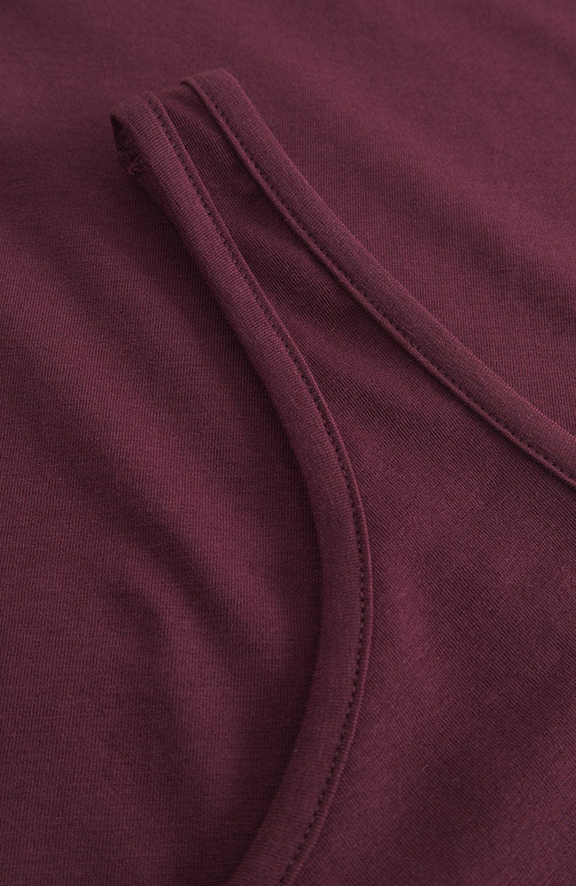 High-quality basic burgundy tank top from Dedicated. The top features a round neckline and back and is made from a blend of organic cotton, Tencel, and a touch of spandex to ensure it retains its shape. The model in the photo is 5'8" and is wearing a size S.