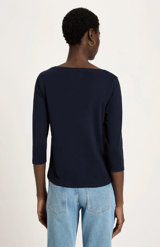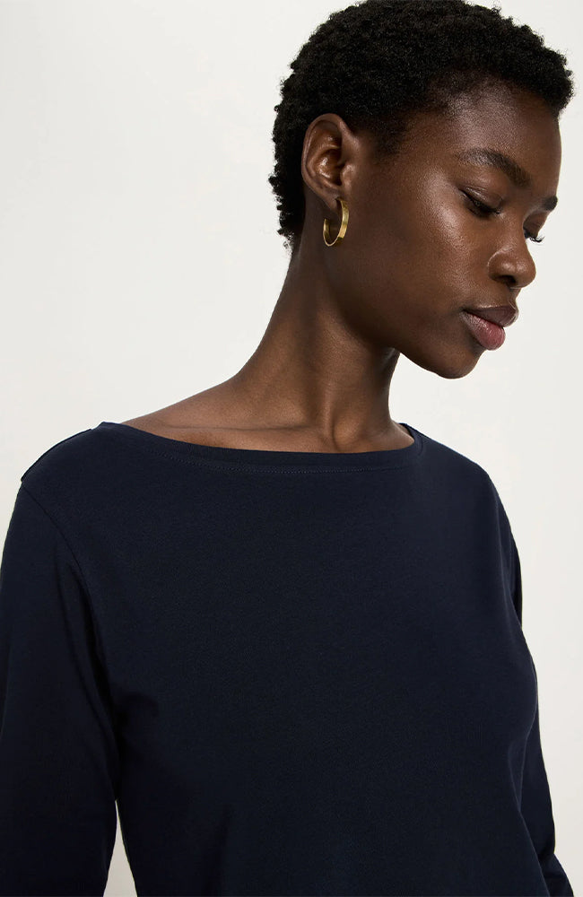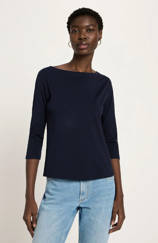Kwalitatieve maar basic driekwart mouw top in een mooie donkerblauwe kleur midnight van het merk LANIUS. Het model heeft een boothals, driekwart mouwen en een straight fit (niet aangesloten, maar ook niet oversized). Gemaakt van zacht en duurzamer biologisch katoen.