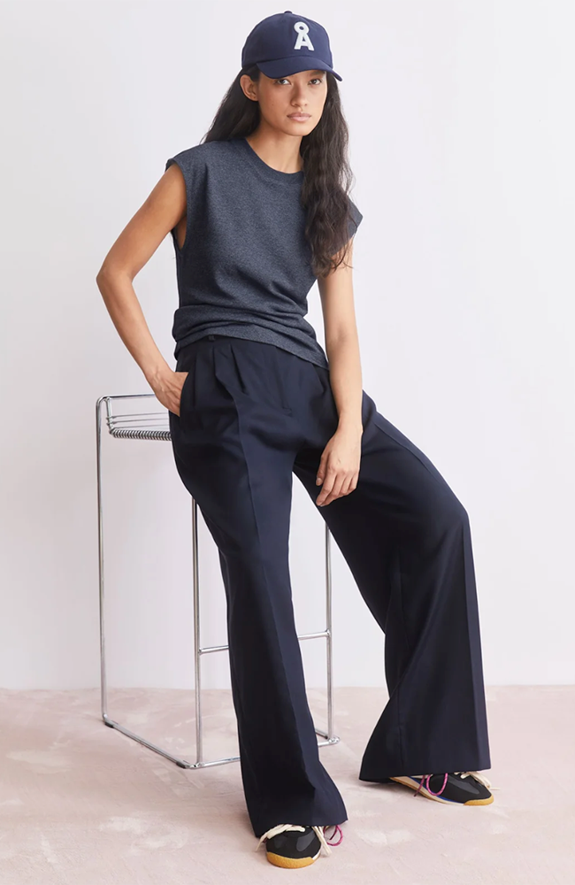 Nice top from ARMEDANGELS in a fun gray melange color. The shirt has a comfortable, loose fit, a high round neck, and cap sleeves. The thicker material (cotton) ensures a nice fit, and the armholes are cut a little deeper.