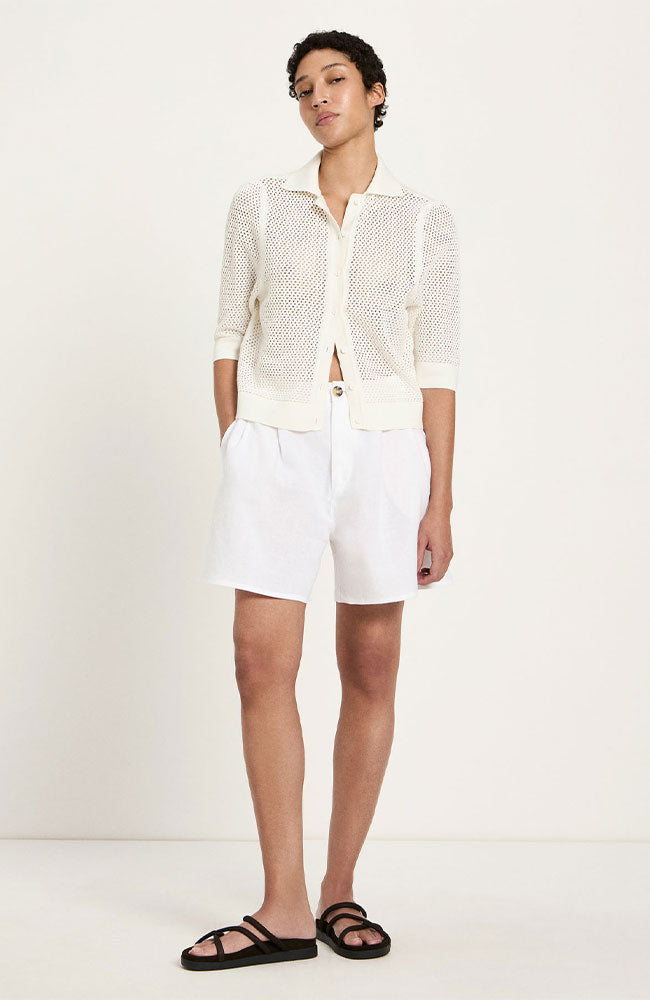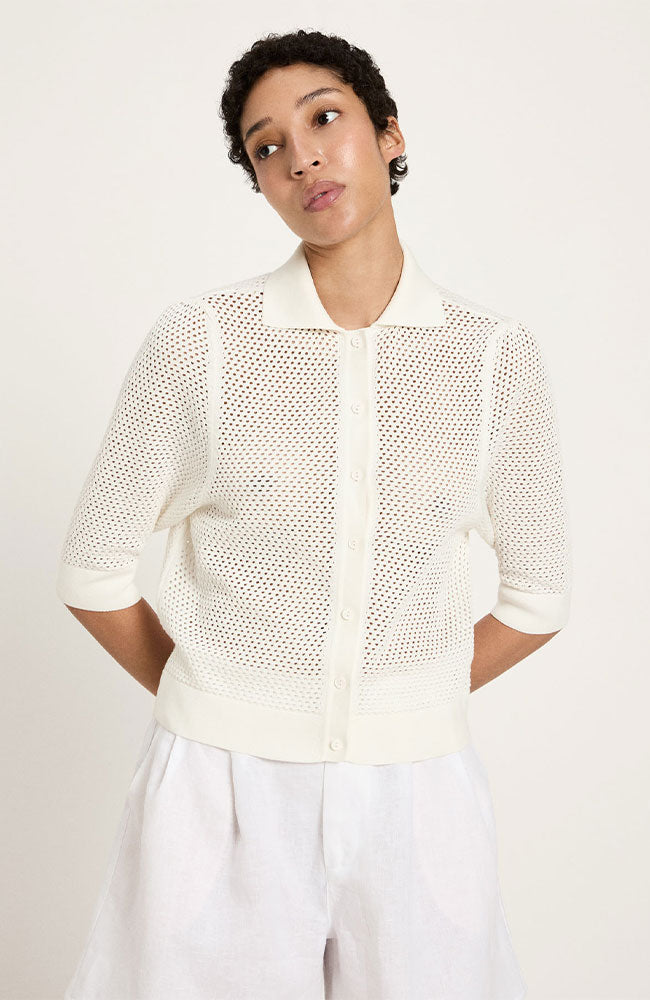 Cool, airy off-white cardigan made from organic cotton by Lanius. The cardigan has a straight fit, openwork knit, polo collar, and buttons at the front. Made from 100% GOTS organic cotton. Wear it casually with a basic top underneath, or combine it with a bright color for a striking look.