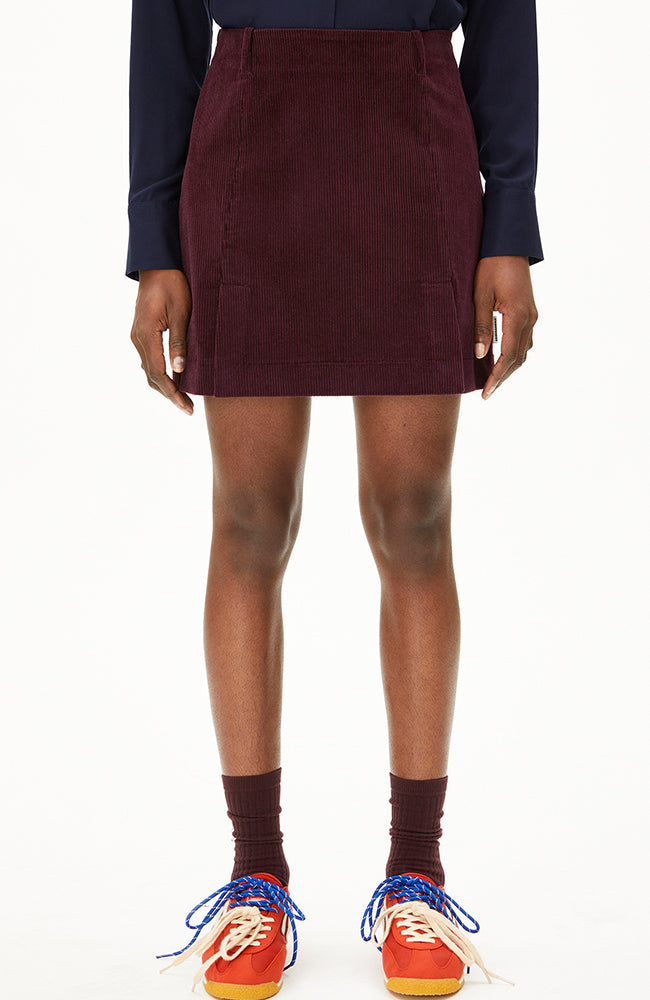 Cute, short rib skirt from ARMEDANGELS in the new color dark cranberry (dark red). The model is high waist, has a hidden zipper, slits a the front and is made of slightly heavier organic cotton.