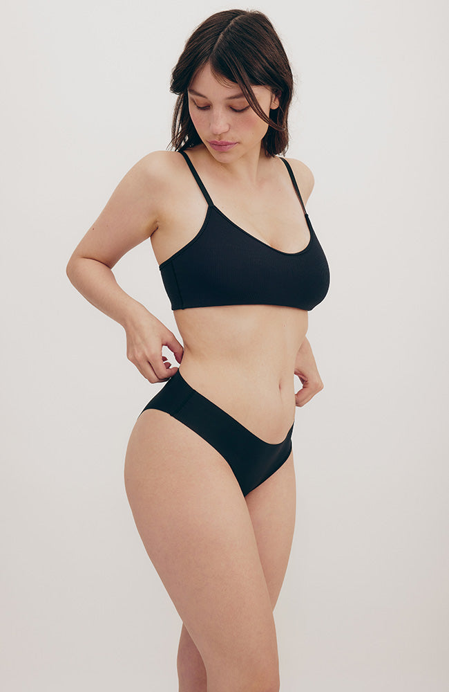 Super soft 'invisible naked rib' thong from the Organic Basics brand in black. The thong is lightweight, very soft and actually feels like you are wearing nothing. She is made of recycled nylon, has a cotton crotch and a rib pattern in the fabric. Wear her with the matching bralette. Please note that underwear cannot be exchanged or returned.