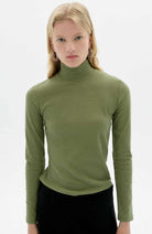 Green long-sleeved turtleneck sweater from Spanish brand Thinking MU. This top has a vertical rib and a small turtleneck around the neckline. She is made of a soft and supple organic cotton X hemp blend.