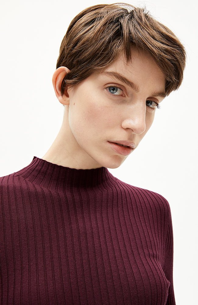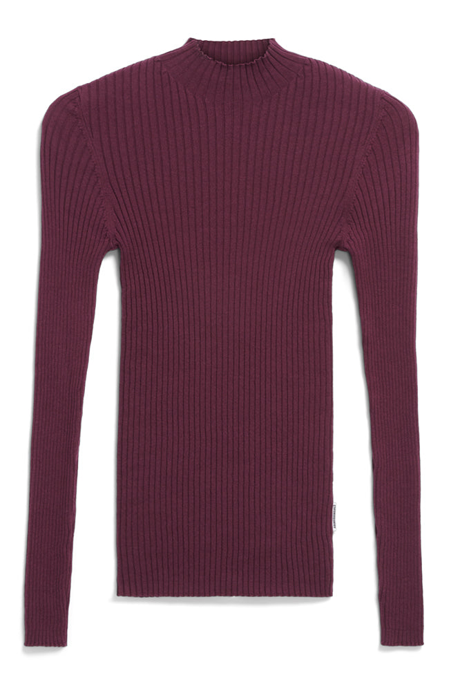 Leuke coltrui in een mooie dieprode 'dark cranberry' kleur van ARMEDANGELS, gemaakt van zacht biologisch katoen. Het welbekende model van de Alaania heeft een geschubde lage col, verticale rib en een aangesloten fit.