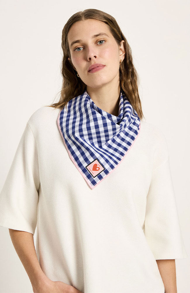 Cute, summery blue and white gingham check scarf from German brand LANIUS. The scarf has a pink border and a love detail in the middle. The light, soft material makes this scarf very versatile. Wear it around your neck, in your hair, or tie it to the handle of your bag as a detail.