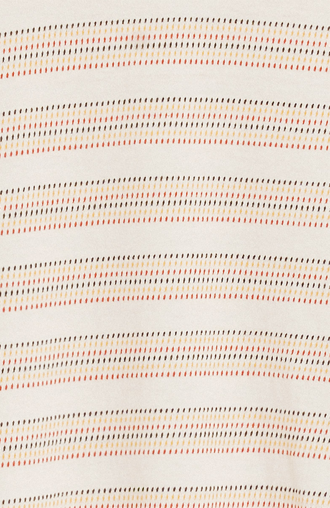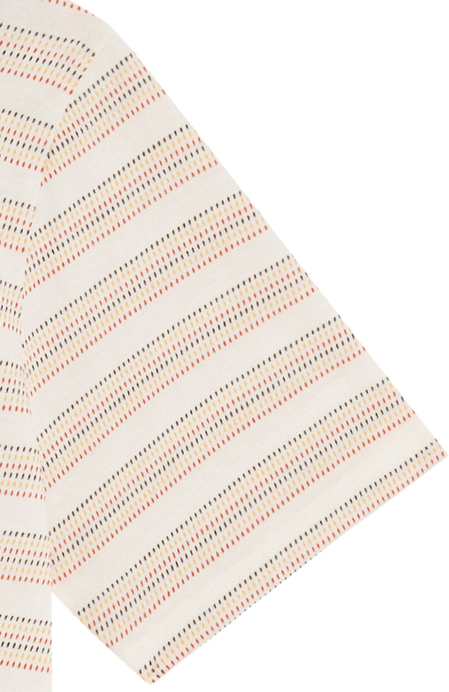 Cute striped (embroidered stripes) T-shirt from Bask in the Sun. The shirt has orange, yellow, and beige stripes and is made from organic cotton, making it wonderfully light and airy to wear.