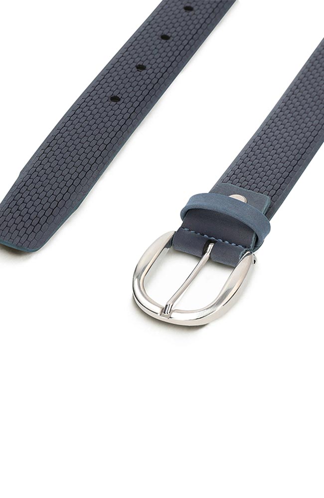 A beautiful blue belt from the Portuguese brand NAE. It is made of faux leather microfiber and features a nickel-free metal buckle. The belt is 3 cm wide.