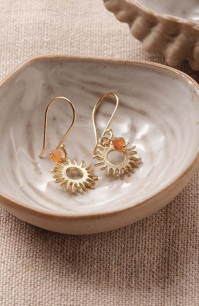Deze goudkleurige zon-oorbellen van A Beautiful Story hebben een carneool steentje als hanger en een zon-bedeltje (energie, vrolijkheid, positiviteit). De carneool steen staat voor courage, creativity and transformation.