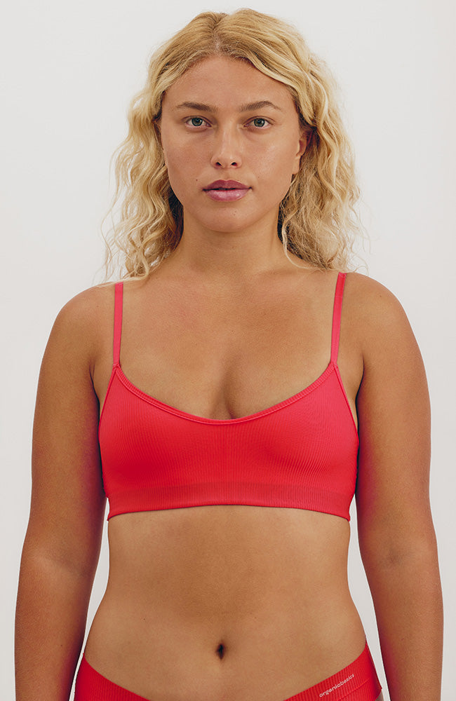 Super soft 'invisible naked rib' bralette from the Organic Basics brand in a new color: strawberry. The bralette is lightweight, very soft and actually feels like you are wearing nothing. She is made of recycled nylon with a rib in the fabric, has a V-neckline, adjustable straps and gives medium support to the bust through the elastic band at the bottom. You put the bralette on over your head, so it has no hook or eye closure. Wear her with the matching thong or hipster.