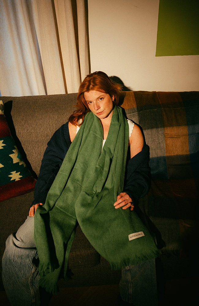 Lekker zachte alpaca wollen geweven sjaal (200x65 cm) van ons nieuwe merk Alpaca Loca. Deze duurzame sjaal is gemaakt van een wol-acryl mix en extreem zacht. De sjaal heeft een mooie groene kleur en kan oneindig gecombineerd worden.